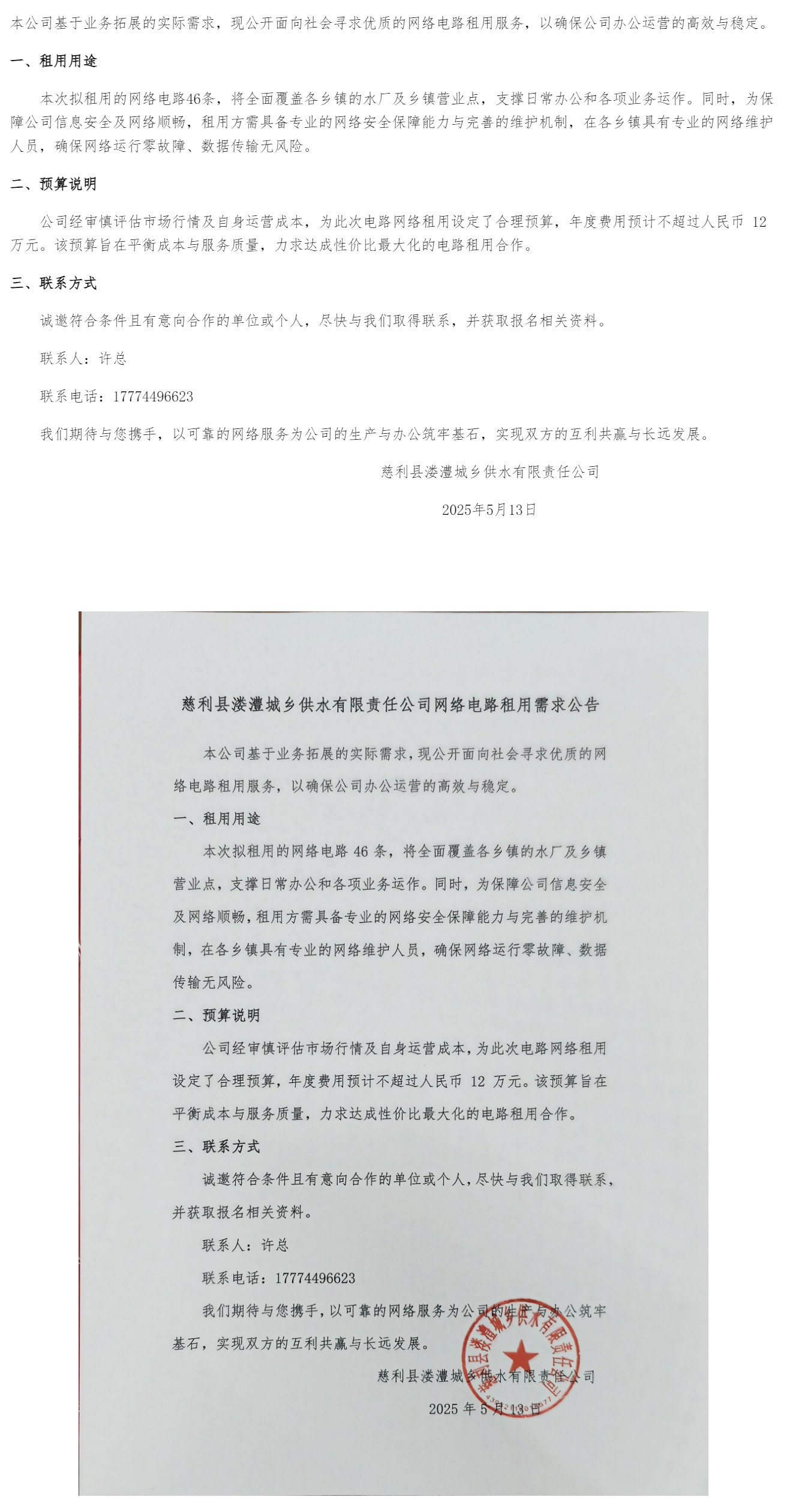 慈利县溇澧城乡供水有限责任公司网络电路租用需求公告