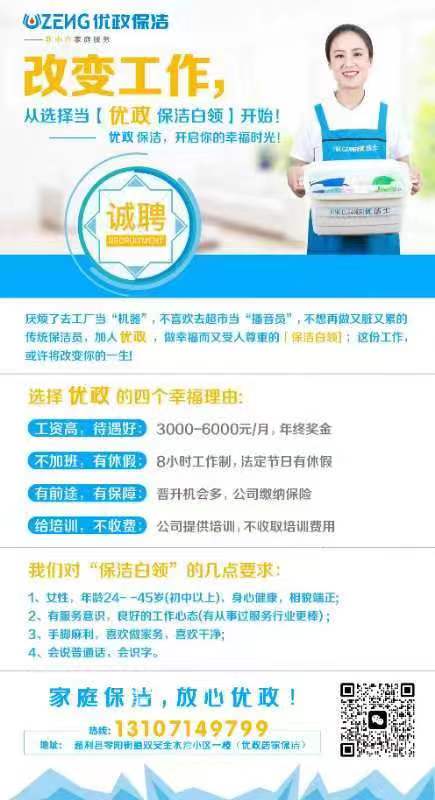 慈利优政是一件非中介家庭服务公司,现招聘保洁白领4名: